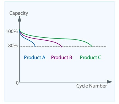电池之充放电使用寿命不只是动力电池需要,所有电池芯产品都有 相同之测试条件,其测试是依照评估者先行定义的充放电条件做为 一个周期,反复测试同一颗电池芯,评估此电池直到测试终止条件 到达前,正确地执行过几个周期,即为此电池之循环周期,而循环 周期次数愈多,代表此电池芯之寿命愈长。进而以同样测试条件测 试不同种类的电池芯,来评估性能优劣,或用来评估某一产品最适 合的充放电条件与使用条件。