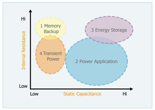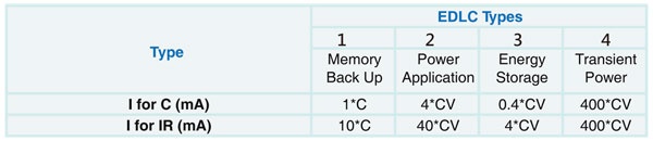 EDLC 之测试为依照其产品之实际应用来区分不同之测试条件。按IEC 62391法规之分类,基本上 EDLC 之产品应用分做四类 1. 记忆体备用电能 应用、2. 电力应用、3. 储能应用、4. 瞬变电源应用。不同测试应用代表不同的测试条件,而测试者应选择合适的测试设备与测试电流,与测试 设备之精度。