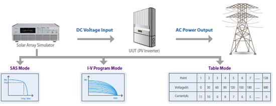 Chroma62150H-1000S具有响应快、可控制、重复性、高稳定性及精准性的模拟I-V曲线直流电源,于单机内建EN50530 & Sandia的SAS模型可简单且方 便设定Voc、Isc、Vmp及Imp等参数后产生一I-V曲线输出,另外具有I-V Program功能可储存100条不同照度及温度下的I-V曲线于记忆体内,并且可 以设定每一条I-V曲线执行时间(1-15,000S),此外也提供一Table模式允许使用者透过数位介面存入128~4096点的V&I 阵列功能,可让使用者编辑任 何遮罩的I-V曲线,以上非常适合验证光伏逆变器(PV Inverter)如下性能: