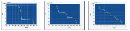 另外实际太阳电池(Solar Array)阵列会因天候如 照度、温度、云遮或下雨而影响输出I-V曲线,Chroma62150H-1000S单机可让使用者储存100条I-V曲线,且可设定每条曲线欲执行输出时间,此可让使用者测试光伏逆变器于不同地区下天候条件的长时间最大功率追踪效能。