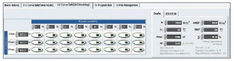 于此Softpanel内建一Sandia及EN50530的Photovoltaic I-V Curve Model,此可方便使用者只需输入欲测试PV Inverter的最大输入功率值(Pmax)、 Fill Factor、Vmin、Vnom及Vmax值,然后使用者可直接按要测试的最大功率百分比值(5%、10%、20%、25%、30%、50%、75%、100%),此Softpanel可自动地产生此测试的太阳电池I-V曲线,接着直接按下载至单机后开始模拟此I-V曲线予PV Inverter测试Conversion Efficiency。