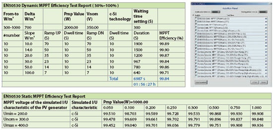 因动态最大功率点追踪效能也会影响逆变器对光伏发电系统所发电能的有效利用及长期投资效益,因此法规EN50530 & Sandia & CGC /GF004订定一标准动态最大功率点跟踪效能测试程序,此可让逆变器设计厂家对于最大功率点追踪演算效能得到一测试及提升。使用者可藉由SoftPanel内建EN50530 & Sandia & CGC/GF004的Dynamic MPPT测试程序选取欲测试项目,此可简单地测试逆变器于研发及品保阶段,当测试执行过程中可即时地计算Energy及MPPT EFF%,并且可将测试追踪过程的读值记录下。