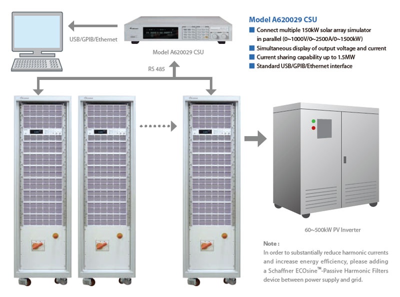 大功率太阳电池阵列模拟需求于商业用及发电站用光伏逆变器测试时,使用者可简单地并联方式连接二台或多台电源模组以达到1.5MW。 Chroma62150H-1000S电源供应器具有主/从并联控制模 式达10台150kW输出,使并联操作模式快速又简易,在此模式中,使用者只需透过前面板或远端数位控制主(Master unit)单机,系统会自动将设定数值下载资料到从属(Slave unit)单机,具有高速同步讯号控制处理,且系统具有自动均流控制。
